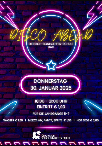 am Donnerstag, den 30.01.2025 (einen Tag vor der Halbjahreszeugnisausgabe), findet wieder die traditionelle Schuldisco der Dietrich-Bonhoeffer-Schule für die Schülerinnen und Schüler der Jahrgangsstufen 5 bis 7 von 18.00 bis 21.00 Uhr in der Pausenhalle statt (Flyer als Datei anbei).